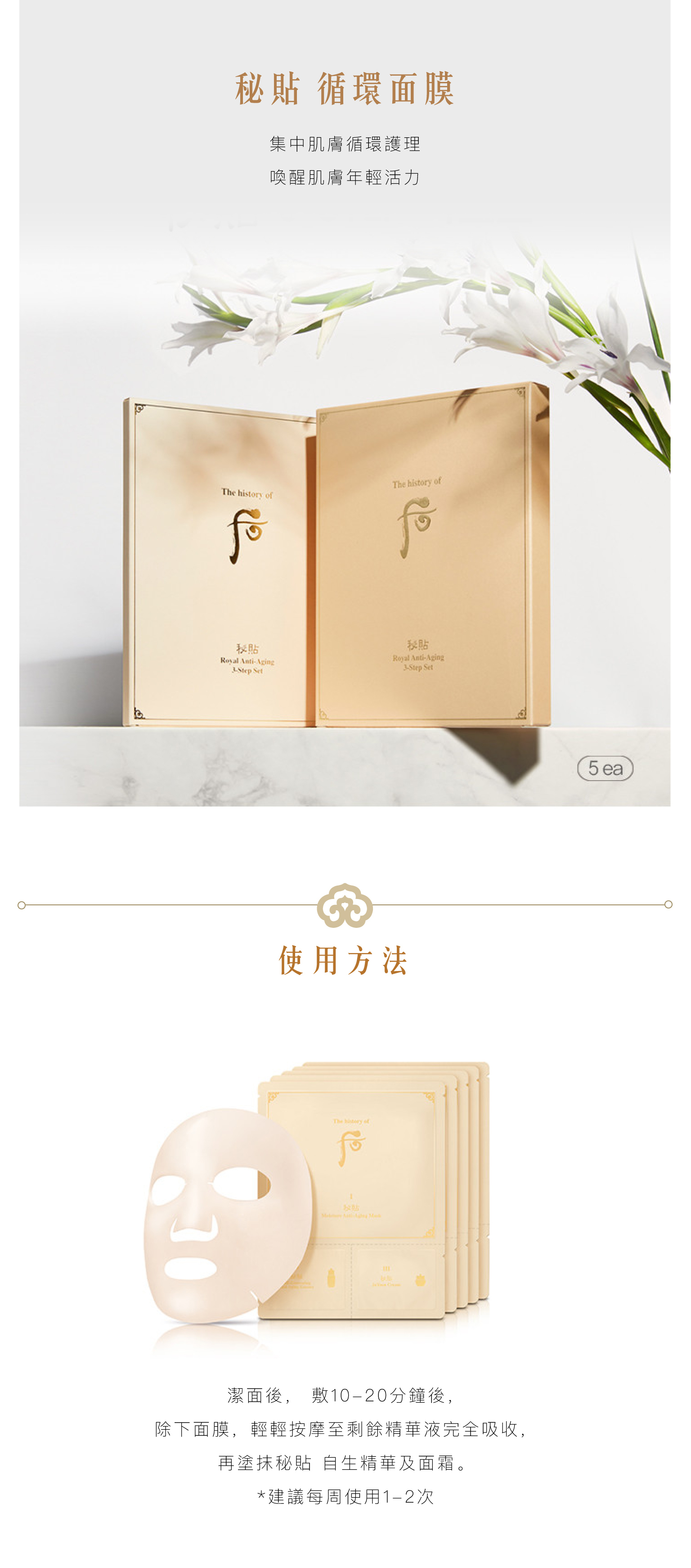 A repairing mask containing 1/3 bottle of the First Care Moisture Anti-Aging Essence, with the “JieYu Pill” as the main ingredient to promote blood circulation and effectively eliminate skin puffiness. GongJinBiDan balances and purifies, creating hydrated, clear and beautiful skin.