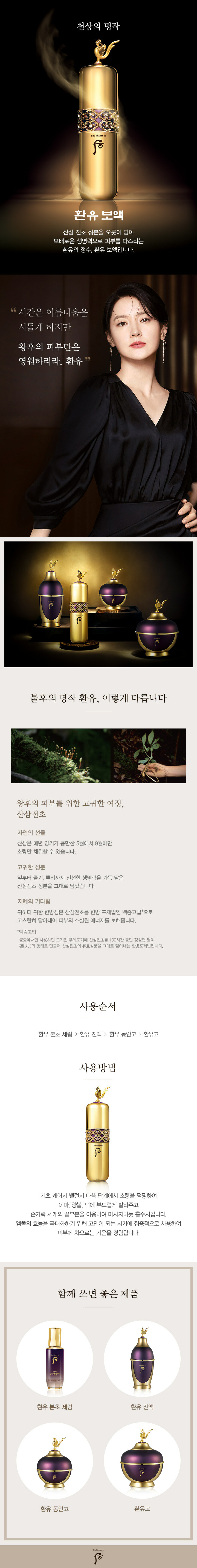 – 為了打造高貴的皇后肌膚,完美地蘊含天然山蔘全草的生命力,通過堅實的研究走過榮耀的 10 年,絕不添加人工色素,30 多年以上的天然山蔘,只有在每年陽氣最旺的 5~9 月之間少量採摘。山蔘全草完美蘊含從山蔘葉子到莖、根部位的所以生命力,通過”后”專有的韓方炮製法”百蒸古法”完美蘊含貴中之貴的韓方成份山蔘全草為肌膚補充所消耗的能量。