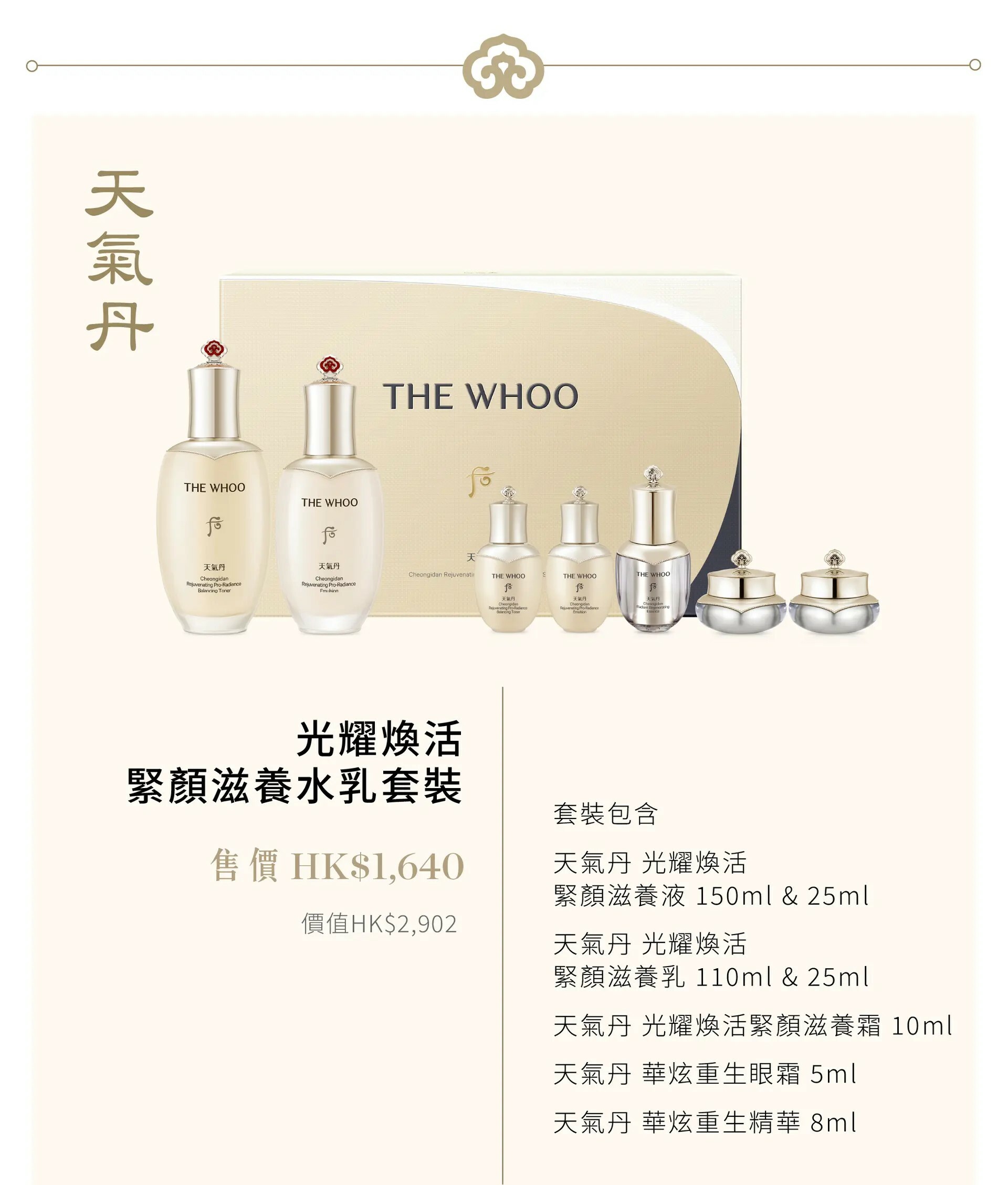 套裝產品包含:天氣丹 光耀煥活緊顏滋養水乳套裝 x1(内含天氣丹 光耀煥活緊顏滋養液 150ml x1 & 25ml x1,天氣丹 光耀煥活緊顏滋養乳 110ml x1 & 25ml x1,天氣丹 光耀煥活緊顏滋養霜 10ml x1,天氣丹 華炫重生眼霜 5ml x1,天氣丹 華炫重生精華 8ml x1)。