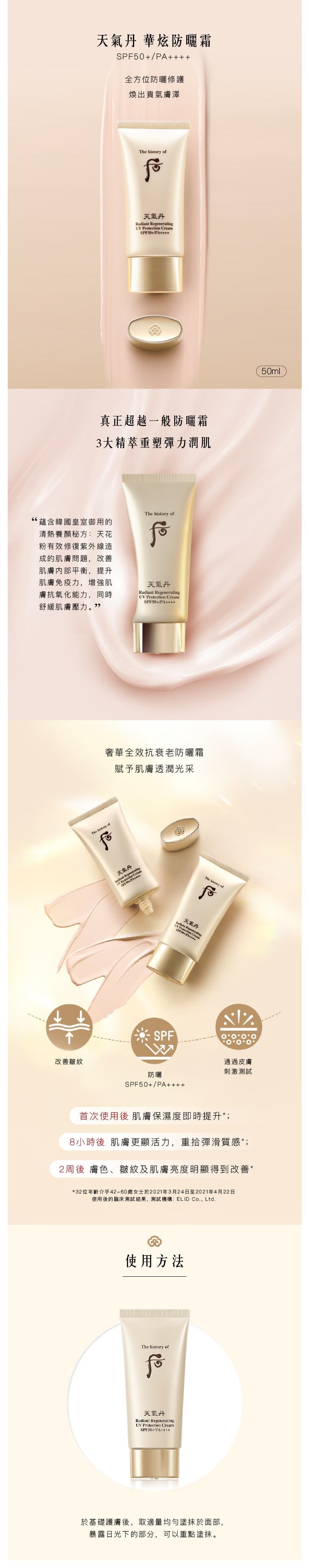 天氣丹 華炫防曬霜 擁有SPF50+/PA++++的高效防防紫外線保護,採用LG研發的天然乳化技術,塗抹後絕不黏膩,肌膚水潤清爽,添加慈禧太后養顏珍貴成分,全面修復6大肌膚問題,令你得到完美的健康肌膚屏障,同時擁有彈滑緊緻的年輕肌膚。